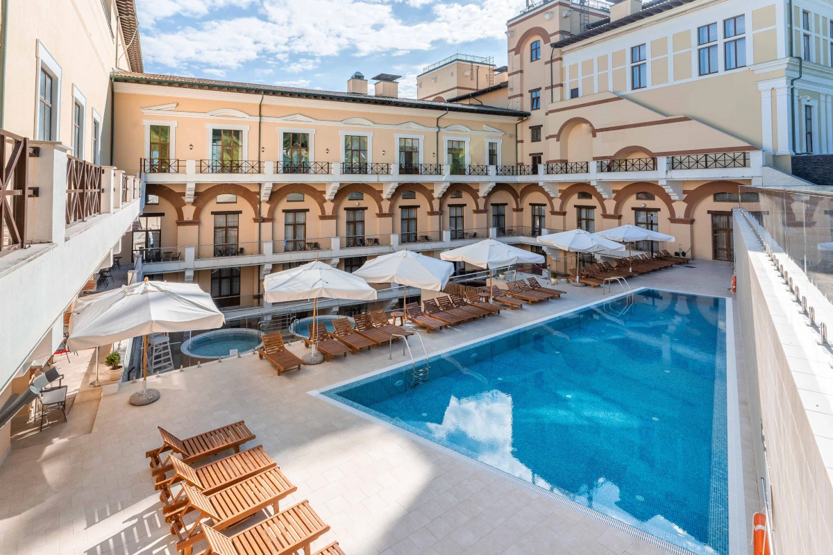 Открытый переливной бассейн расположен на самом верхнем уровне 6 этажа отеля. В бассейне круглый год поддерживается комфортная температура.