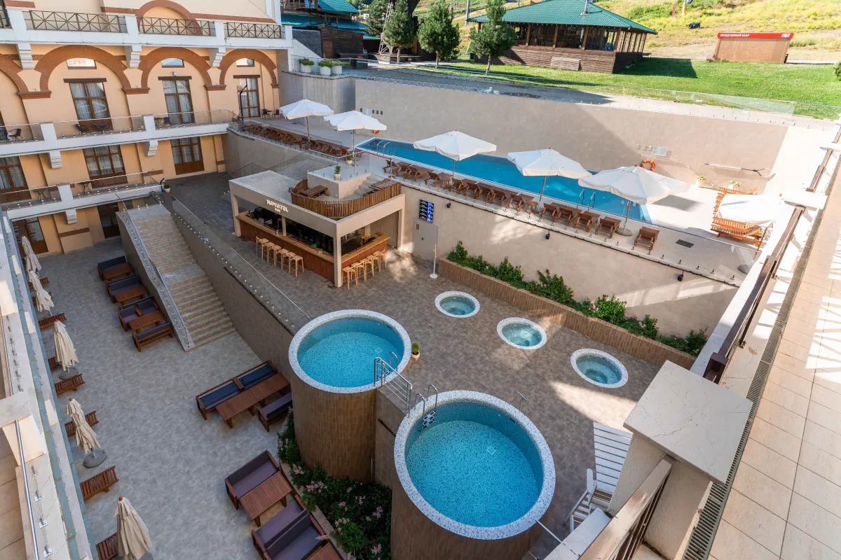 Стильная и современная зона отдыха под открытом небом и прекрасным видом на горы располагается во внутреннем дворике отеля, на уровне 4-6 этажей: